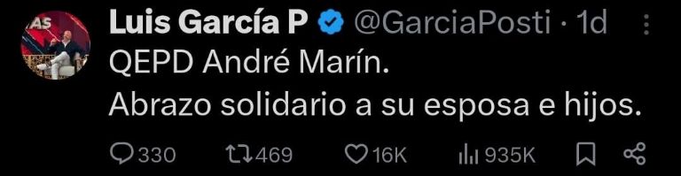Luis García puso en su cuenta de X: “QEPD André Marín. Abrazo solidario a su esposa e hijos”. El post del Doctor detonó la red social, ya tiene más de 16 mil ‘me gusta’, 450 reposteos y 300 comentarios. La mayoría de las reacciones de los internautas revientan al comentarista, lo acusan de redactar una “falsa” condolencia a la familia de su ex compañero en TV Azteca, otros añadieron que no era obligatorio escribir.