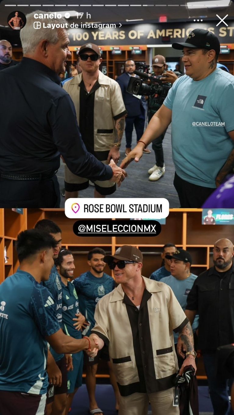 Canelo Álvarez tuvo un reencuentro con la Selección Mexicana y con su nuevo Director Técnico Javier Aguirre, así como con su auxiliar de lujo, Rafa Márquez. Este hecho se dio en el Estadio Rose Bowl de Pasadena, California. Durante su visita del pugilista al vestidor de los seleccionados, el boxeador saludo uno por uno a los futbolistas antes de su triunfo ante Nueva Zelanda.