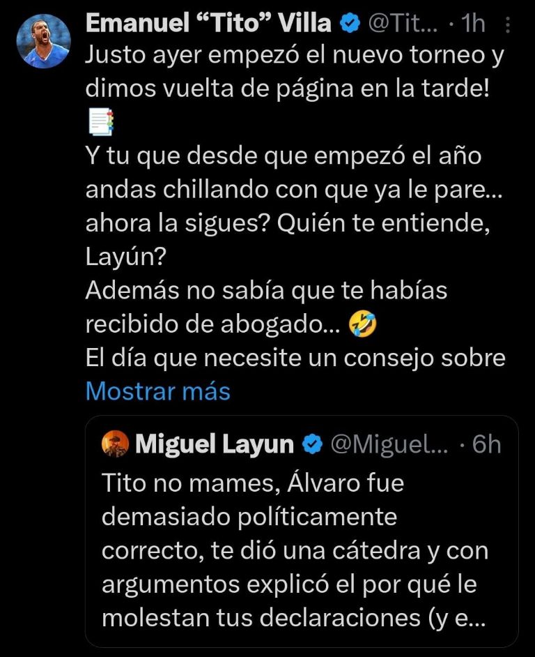 Tito Villa no se quedó callado, llamó “chillón” a Miguel Layún e incluso bromeó al mencionar que desconoce cuándo se graduó de abogado. Al final le deseó éxito en la Kings League, donde afirmó sí la está rompiendo. Sin duda se prendieron las redes sociales con el intercambio de declaraciones entre dos ex jugadores con largo paso en las canchas del futbol mexicano. El tricampeonato del América todavía da de qué hablar.