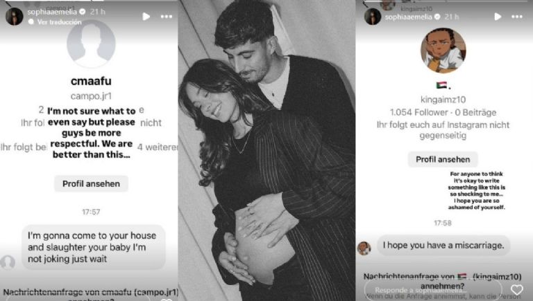 A través de sus redes sociales, la mujer del futbolista ha denunciado mensajes de odio y amenazas directas hacia ella y su futuro hijo. Entre los mensajes más perturbadores se encuentran: "Espero que tengas un aborto" y "voy a ir a tu casa y asesinar a tu bebé. No estoy bromeando".