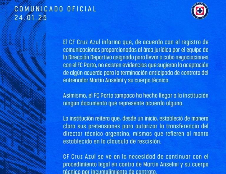 Al parecer el caso de Martín Anselmi con Cruz Azul seguirá y por mucho tiempo, mínimo hasta que todo se arregle de la manera legal, puesto que, ahora ha salido a la luz que, la Máquina negó cualquier tipo de trato con el Porto, y al parecer han tomado medidas legales contra el equipo más ganador de la Liga de Futbol en Portugal.