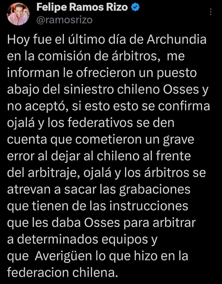 Felipe Ramos Rizo criticó la designación de Enrique Osses tras recordar que en 2022 fue acusado de corrupción durante su gestión al frente de la Comisión de Árbitros chilena. En ese entonces se reveló que se encontraron más de 9 millones de pesos en pagos con facturas falsas. “Las boletas se comenzaron a emitir en fecha junio de 2019, durante el periodo de la presidencia de Enrique Osses Zencovich”, acusó Javier Castrilli, otro exmandamás del arbitraje andino.