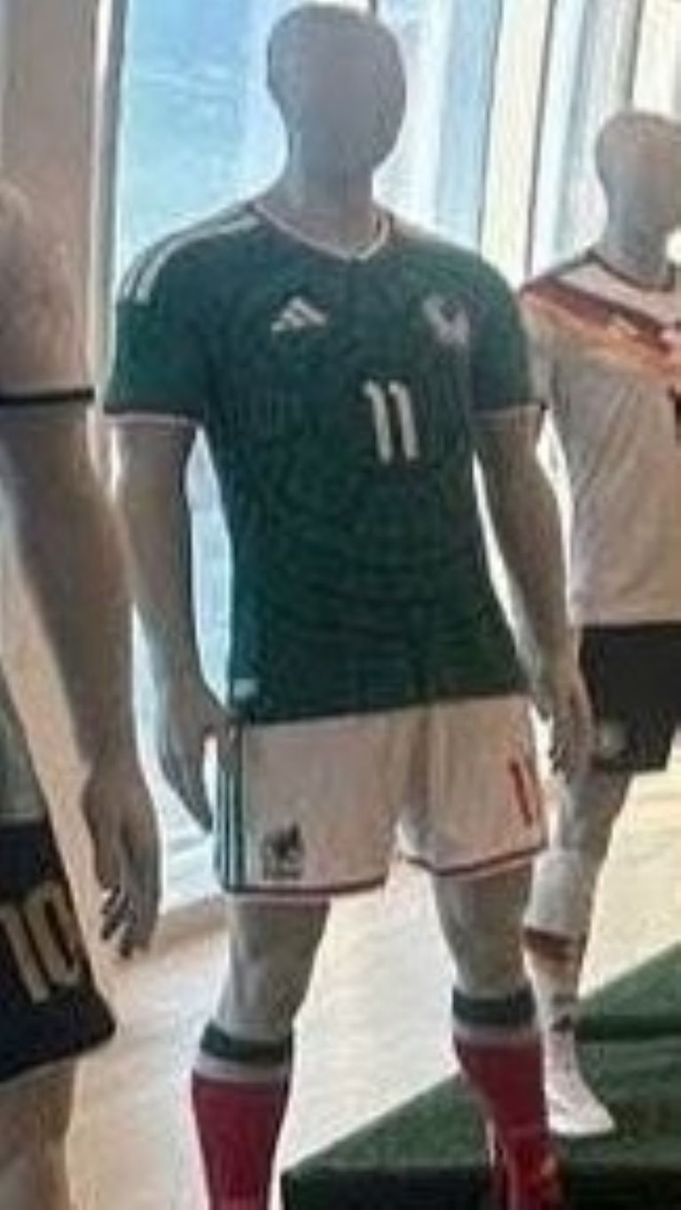 Asimismo, se muestra que en el centro está un "Calendario Azteca", recordando el diseño que presentó México en el Mundial de Francia 1998. Esta playera tendría franjas blancas en las mangas; además, tiene un cuello en "V", con las mismas líneas en color blanco. Mientras que el short es blanco, con vivos en rojo, al igual que las calcetas.