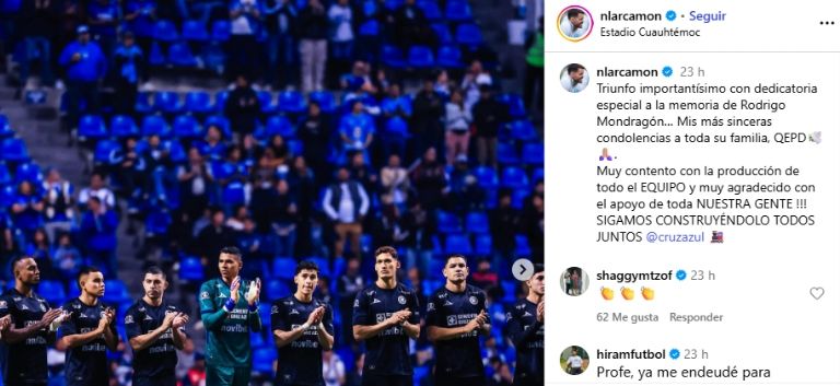 "Triunfo importantísimo con dedicatoria especial a la memoria de Rodrigo Mondragón. Mis más sinceras condolencias a toda su familia. QEPD", estableció el timonel oriundo de Buenos Aires. El perfil oficial de Cruz Azul aplaudió su comentario en la publicación, tal como el exjugador José Joaquín "Shaggy" Martínez.