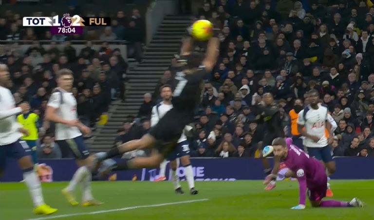 Los Spurs cobraron un tiro de esquina y Lucas Bergvall logró rematar de cabeza, de espalas al arco, pero el balón salió directo a segundo poste, por lo que Bernd Leno se quedó sin oportunidad de atajar el balón. Sin embargo, apareció la figura del atacante tricolor, quien saltó para rechazar al pelota, evitando la caída de su marco.