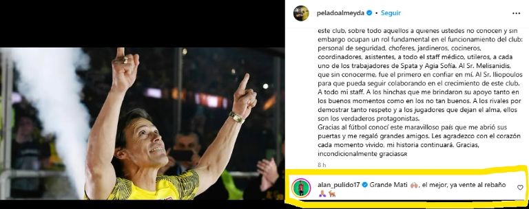 A través de Instagram, el técnico argentino publicó un mensaje de agradecimiento para el AEK Atenas tras concluir su etapa, situación que no dejó pasar Alan Pulido.