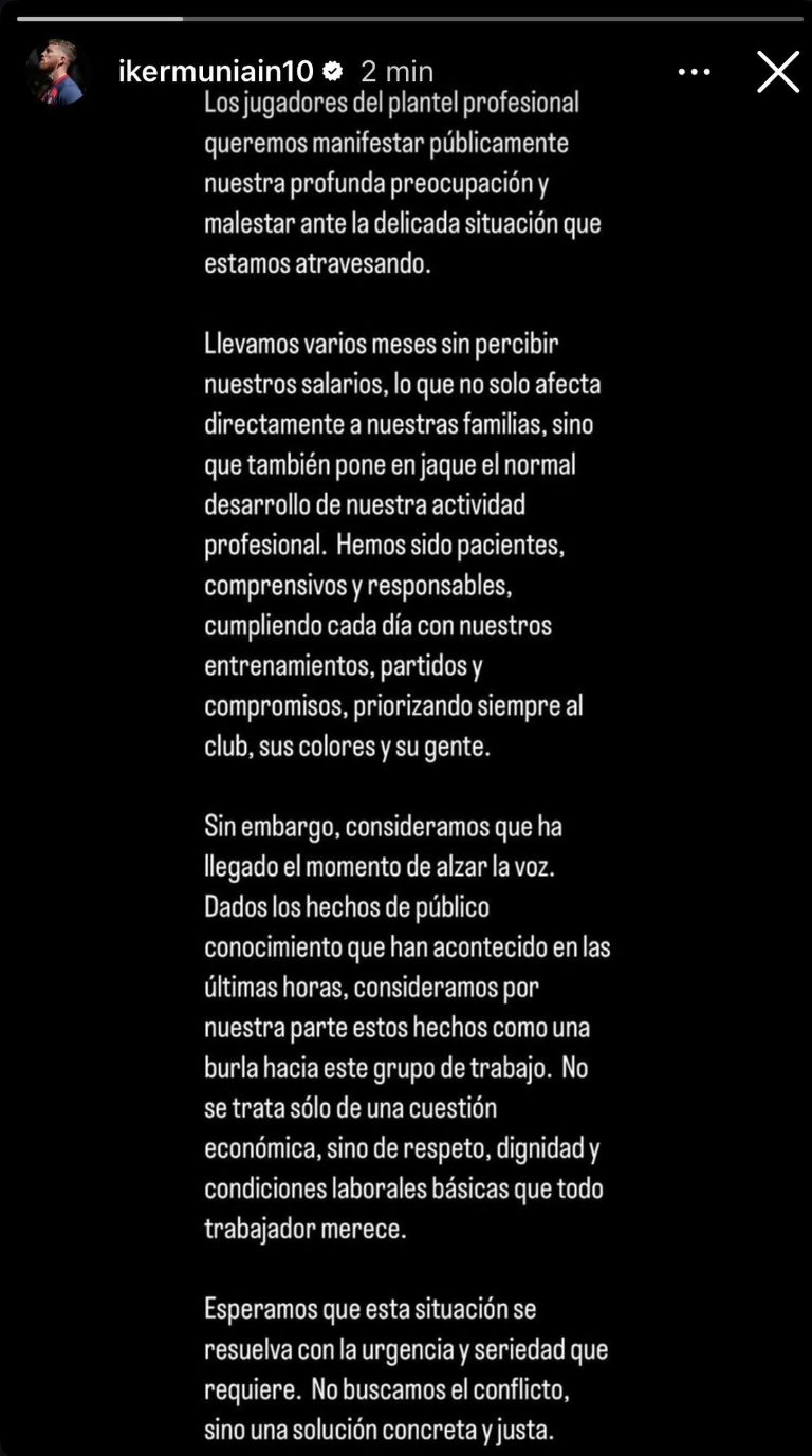 El mediocampista español Iker Muniain, quien milita en el club San Lorenzo de Argentina, expuso en redes sociales la situación extrema que viven él y sus compañeros, pues el equipo no ha cumplido con los pagos por su trabajo.