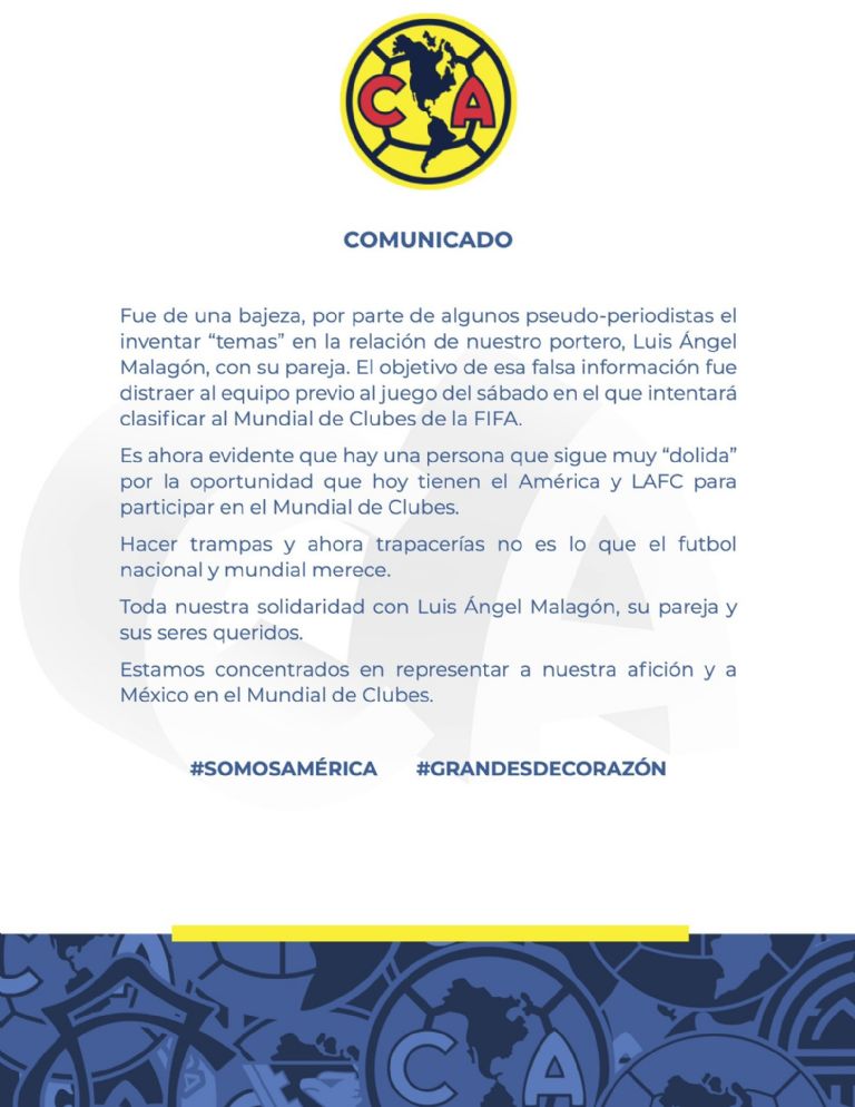 "Es ahora evidente que hay una persona que sigue muy “dolida” por la oportunidad que hoy tienen el América y LAFC para participar en el Mundial de Clubes. Hacer trampas y ahora trapacerías no es lo que el futbol nacional y mundial merece. Toda nuestra solidaridad con Luis Ángel Malagón, su pareja y sus seres queridos. Estamos concentrados en representar a nuestra afición y a México en el Mundial de Clubes”, se lee en el comunicado que emitieron las Águilas.