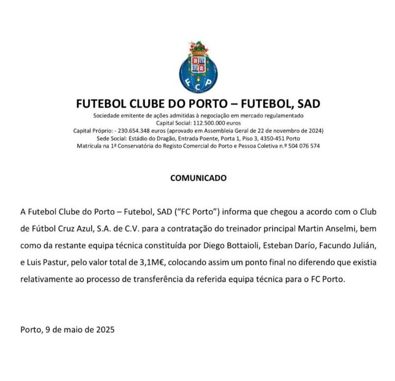 "El Porto informa que llegó a un acuerdo con Cruz Azul por la contratación de Martín Anselmi y su cuerpo técnico, por 3.1 millones de euros, cerrando así las diferencias en su transferencia", detalló el conjunto europeo.