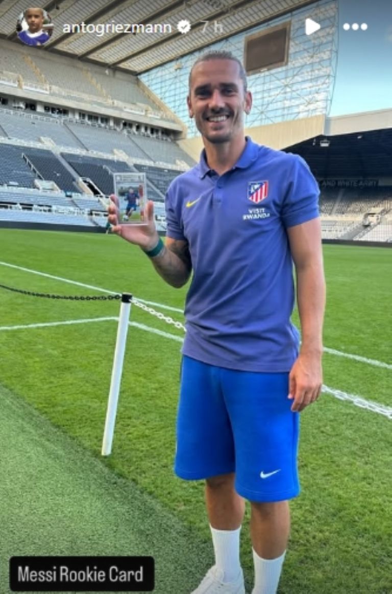 A través de sus redes sociales, el atacante del Atlético de Madrid compartió un par de fotos con la tarjeta Panini de "La Pulga", la cual tiene en un muy buen estado y en empaque especial.