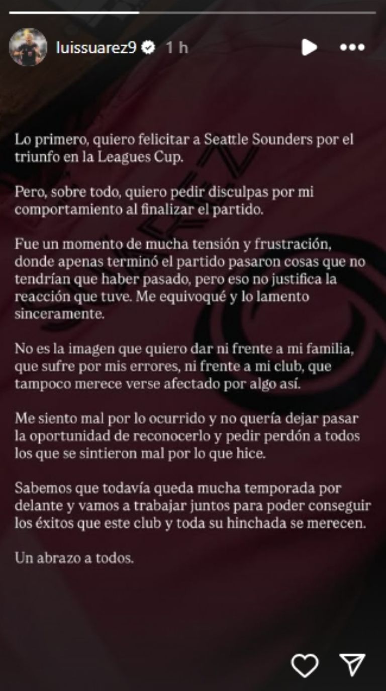A través de una historia de Instagram, Luis Suárez se mostró vulnerable y primero felicitó al Seattle Sounders por su coronación en la Leagues Cup.