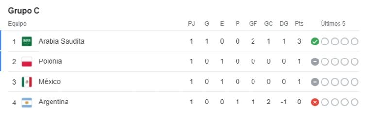 Para sorpresa de propios y extraños, después de la Jornada 1 del Mundial de Qatar 2022 es Arabia Saudita quien domina el Grupo C con 3 puntos, dos goles a favor y uno en contra, concretando así la sorpresa máxima en este inicio del torneo y colocando a la Albiceleste con un pie fuera de los octavos de final del certamen en turno.