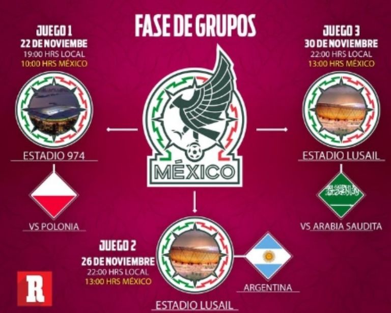 - Arabia Saudita vs México | miércoles 30 de noviembre | 13:00 horas | Estadio Lusail.