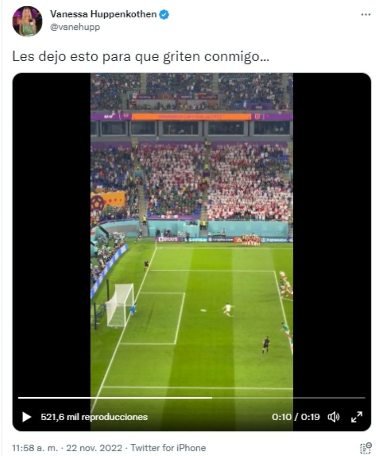 Al momento de la atajada, Vanessa y todos los aficionados mexicanos presentes gritaron de emoción, pero la conductora enloqueció con gritos fuertes de felicidad y éxtasis provocada por la buena actuación de Ochoa, que de lo contrario tendría a la Selección Mexicana aún con vida tras repartir puntos con los polacos, a días de medirse a una golpeada Argentina que perdió contra Arabia Saudita.