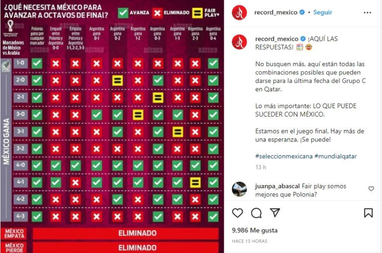 En estos momentos, México es el último lugar del Grupo C con 1 punto, 0 goles a favor y 2 en contra. Pese a ello, el cuadro nacional aún cuenta con varias posibilidades de acceder a los octavos de final, instancia a la que llegaría por octava ocasión consecutiva desde Estados Unidos 1994 si se concretan esta serie de combinaciones.