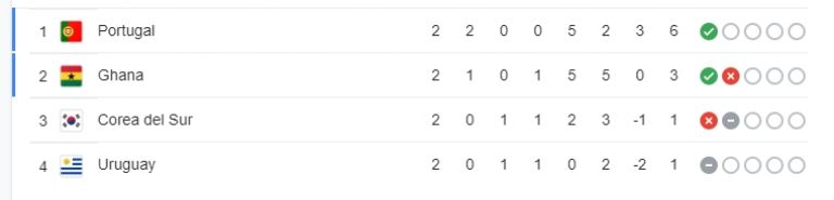 Corea del Sur se mantiene en el tercer sitio al registrar un empate y una derrota, así como una diferencia de goles de -1. Finalmente, el cuadro que se encuentra en la última posición es nada más y nada menos que Uruguay, selección que no solo registra 1 unidad después de haberse terminado la Jornada 2, sino que, además, acumula 0 goles a favor y 2 tantos en contra.