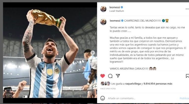 Messi es la sensación de las redes sociales. Las fotos, posteos memes y comentarios no paran de llegar desde que se pitara el final del partido en el Estadio Lusail. Aquel espacio donde muchas veces fue acabado, hoy es el gran protagonista y como era de esperarse, no tardó en llegar su propia publicación para celebrar con todos sus seguidores.