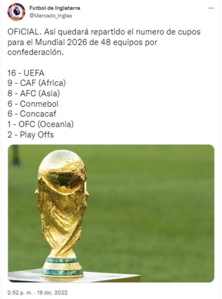 En redes sociales ha comenzado a hacerse tendencia todo aquello relacionado con el Mundial del 2026 toda vez que este se disputará a mediados del año, por lo que restan poco más de tres años y medio para su inicio. Dentro de lo más destacado aparecen los cupos de cada Confederación, los cuales aumentarán de manera significativa en función de Qatar 2022.