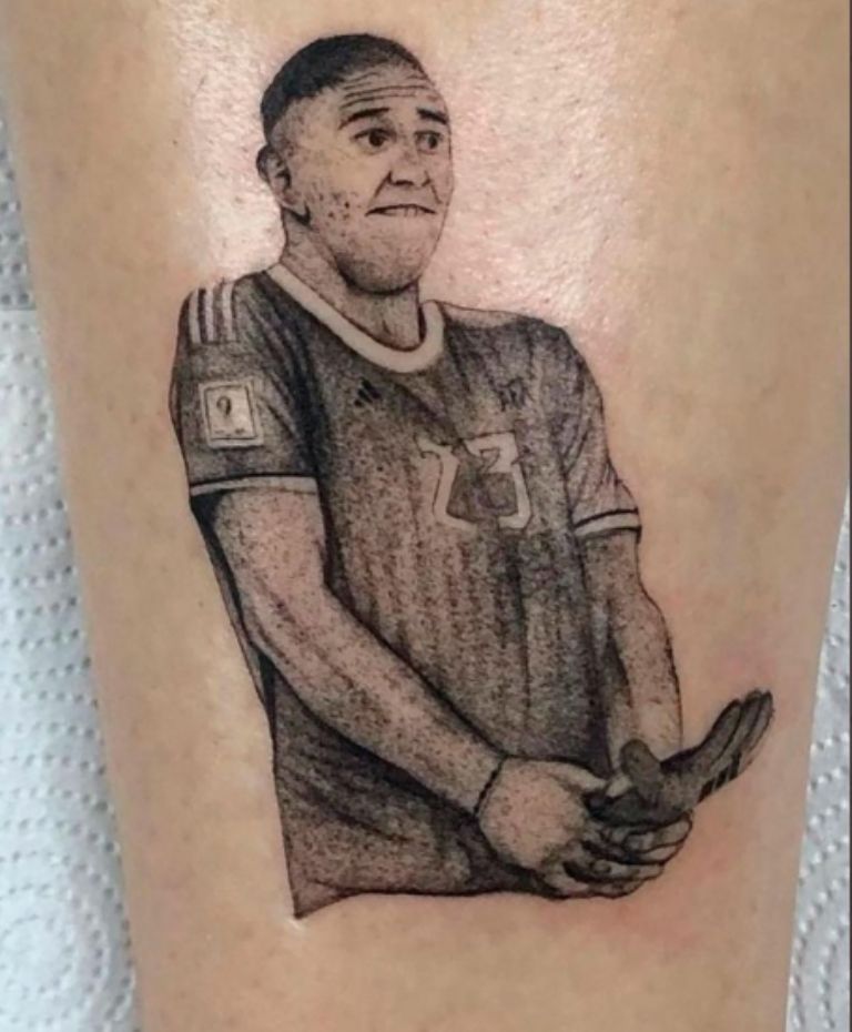 Finalmente, en uno más se aprecia al Dibu Martínez, quien se ha convertido en uno de los futbolistas más polémicos de la Selección Argentina por sus constantes burlas hacia sus rivales. En este tatuaje se observa al jugador de la Premier League con el Guante de Oro en la parte baja de su abdomen, haciendo alusión a su festejo tras el campeonato mundial.