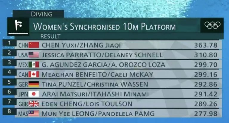 La dupla mexicana se consagró en el tercer sitio con 299.70 puntos. Estados Unidos fue segundo con 310.80 y China con el título olímpico al sumar 363.78.
