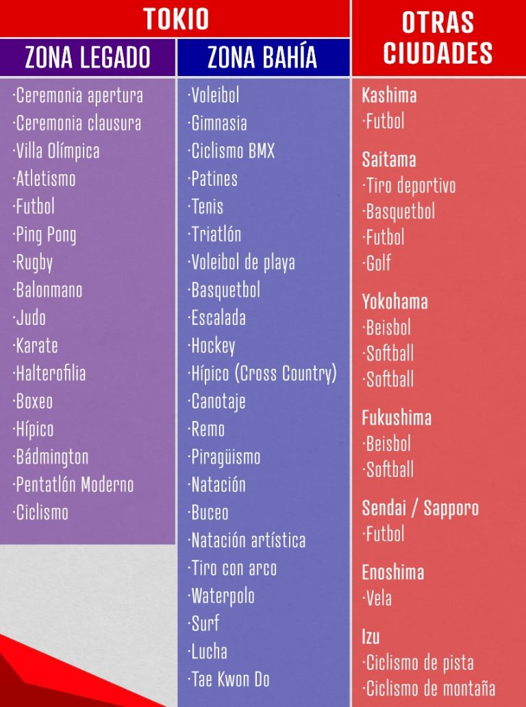 Los Juegos Olímpicos de Tokio 2020 tendrán 42 sedes en 9 ciudades diferentes de Japón. En la capital del país, sede principal de la justa, habrá dos zonas principales denominadas Zona Legado y Zona Bahía.