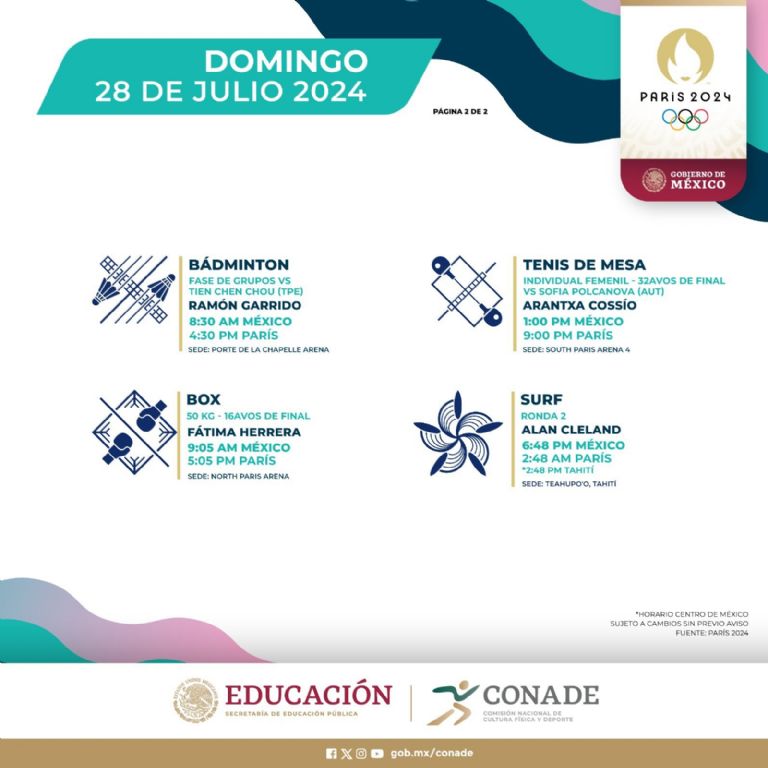 MIentras estos deportistas harán su aparición en el calendario de competencias de este domingo 28 de julio en los Juegos Olímpicos de París 2024, los atletas mexicanos que ya fueron eliminados o descalificados en sus respectivos deportes son Gibrán Zea (esgrima), Alejandra Zavala (tiro deportivo), Sofía Reinoso (canotaje slalom), Goretti Zumaya y Edson Ramírez (tiro deportivo y Marcos Madrid (tenis de mesa).