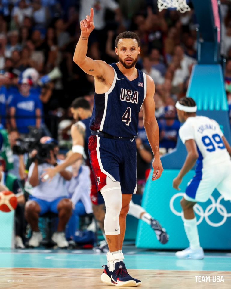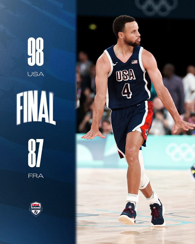 Al grito de "¡USA! ¡USA!" en la tribuna, donde todos esperaban secretamente ver caer al gigante del basquetbol mundial y alzarse con el triunfo a los anfritiones franceses, en el cuarto y último parcial Francia salió a vencer cara la derrota, acortando la diferencia 77-82 a 3:14 del final y 79-82 poquito después, aunque el Dream Team sacó la casta y con triples de Curry se volvió a alejar primero 85-79 y luego 93-84, confirmando su calidad de mejor tirador de la historia y oro en París 2024 al mandar a todos a dormir al poner el 96-87 a solo segundos del final... ¡Cuatro triples consecutivos!