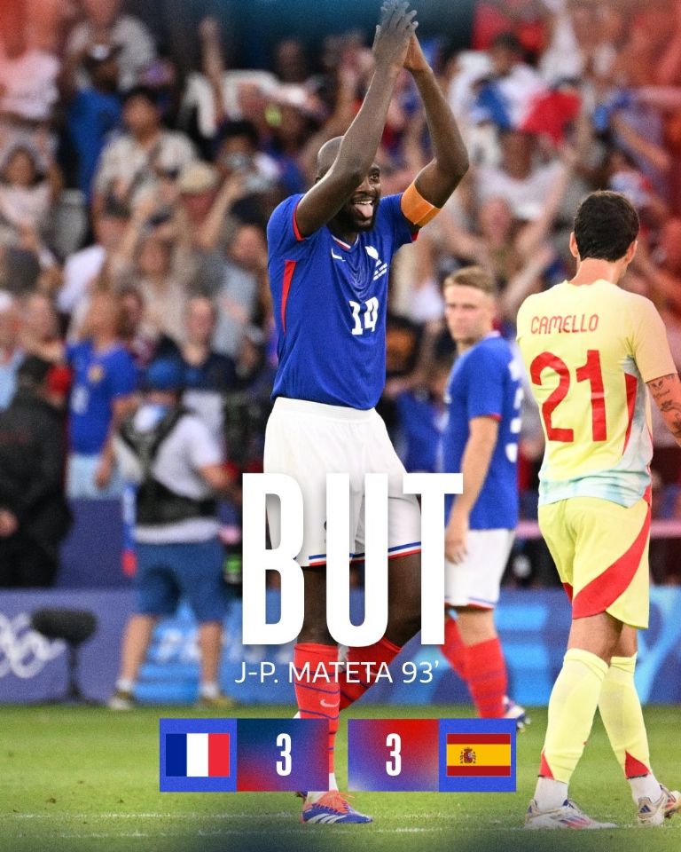 Ah, pero no todo estaba dicho, pues al 78' y en un tiro libre por derecha, Maghnes Akliouche cobró con potencia y la pelota pasó sin tocar a alguien, para luego de un rebote anidarse en el poste contratio de la portería española para el 2-3. La locura, no obstante, estalló al 90+1 cuando el árbirtro marcó penal contra España por un jalón de Turrientes dentro del área, que hizo bueno un par de minutos después Jean-Philippe Mateta para el 3-3 y los tiempos extra, séptimos en la historia de los Juegos Olímpicos y terceros consecutivos.