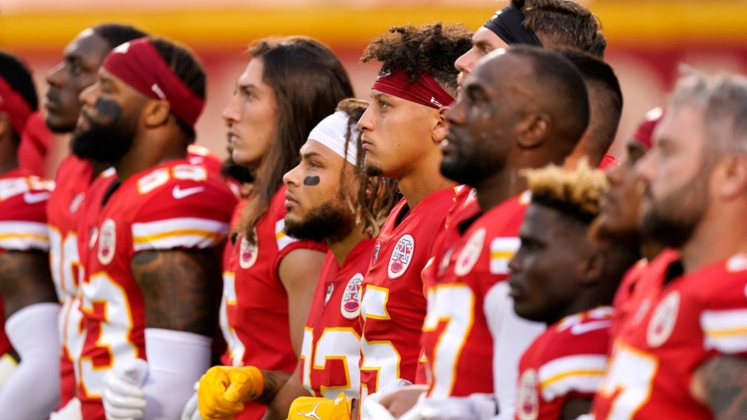 Luego de saltar a la cancha del Arrowhead Stadium, jugadores de Chiefs y Texans se entrelazaron para formar una cadena humana, después de la ceremonia del himno nacional.