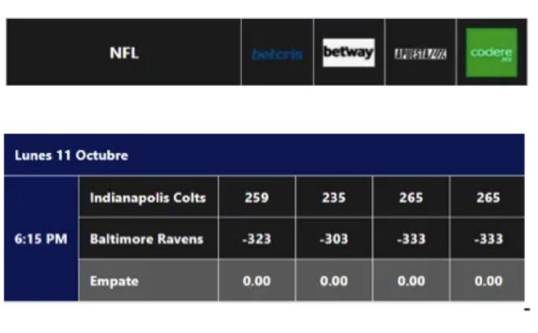 Money line: Ravens -323 Apuesta $323 para ganar $100 / Colts +259 (Apuesta $100 para ganar $25)
