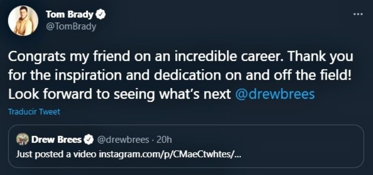 "Felicitaciones por tu increíble carrera amigo. Gracias por toda la inspiración y dedicación que nos brindaste y ahora estaré atento al siguiente capitulo de tu vida", le escribió Brady a Brees en una publicación en su cuenta de Twitter.