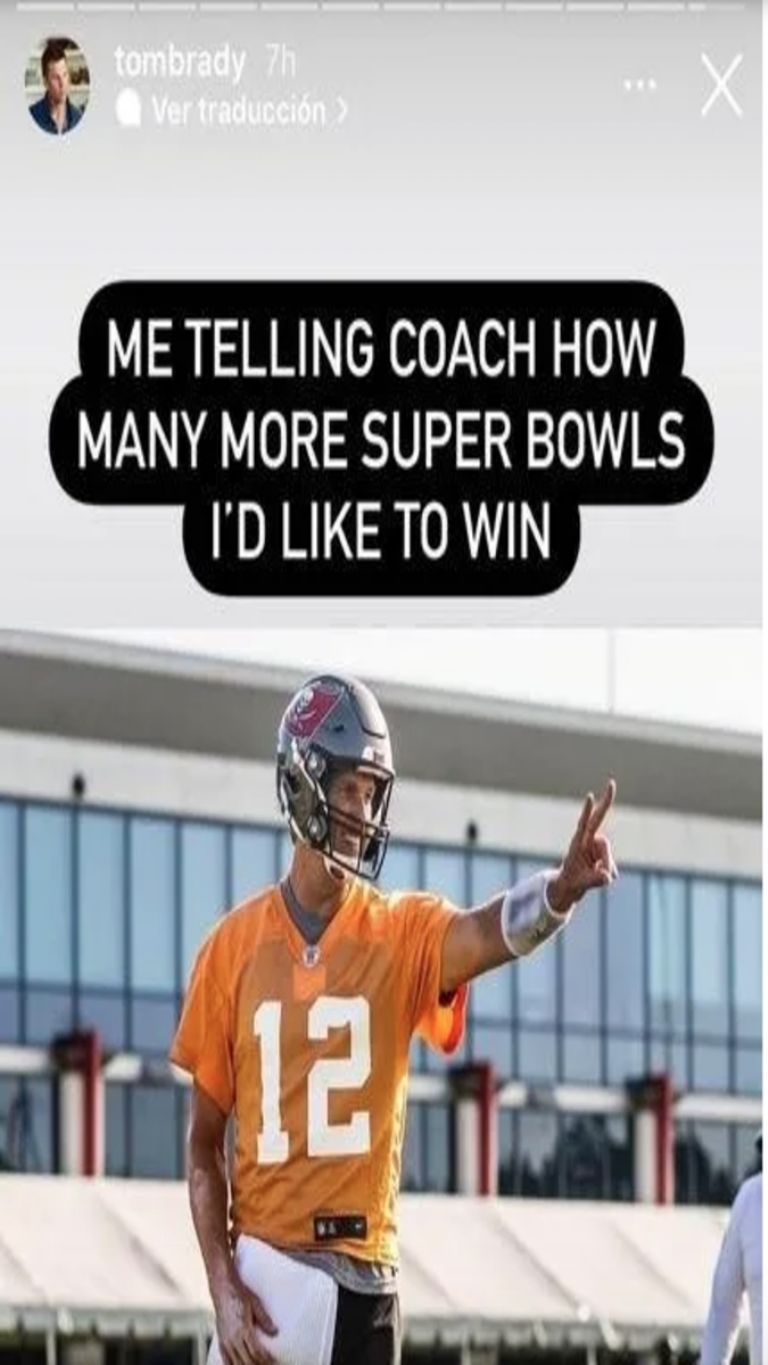 El objetivo de Tom es ganar dos Super Bowls más en la NFL: “Yo diciéndole al entrenador cuántos Super Bowls más me gustaría ganar” publicó Brady en su cuenta de Instragram con una foto como historia en la que se ve como hace el número dos con sus dedos de la mano izquierda. ¿Creen que pueda lograr su objetivo?