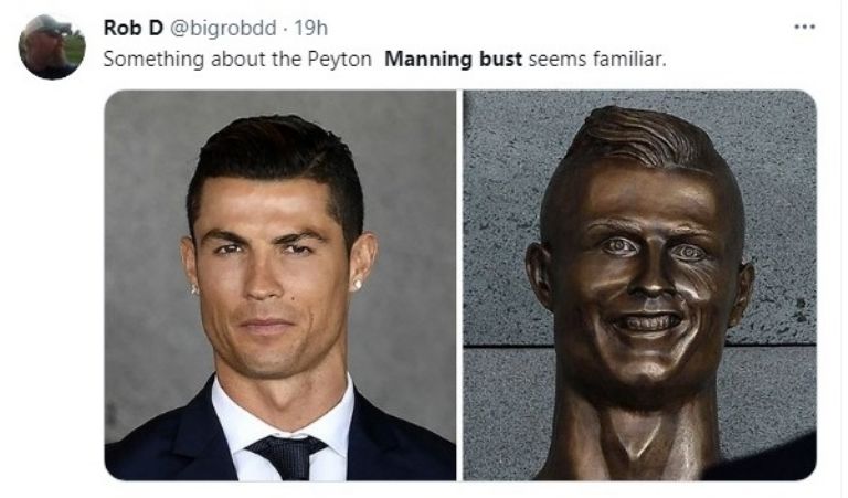 La obra de bronce refleja un semblante molesto de histórico quarterback, una gran frente y recibió críticas y bromas en redes sociales.