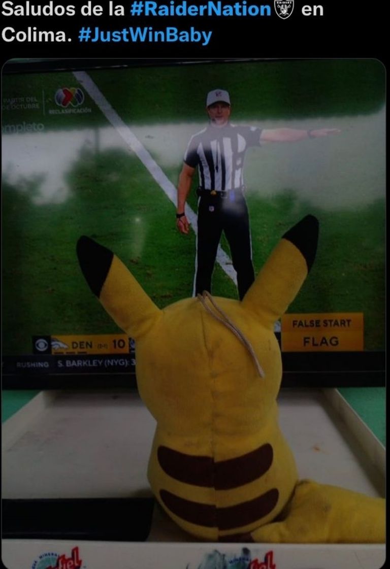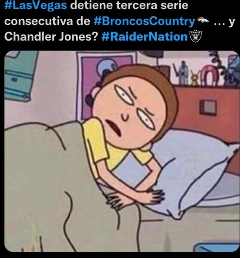 Luego de tres fechas, los memes festejan la primer victoria de Las Vegas Raiders ante los Broncos de Denver en la Semana 4 de la NFL. A 9 minutos de terminar el primer cuarto, el que movió las cadenas fue Carlson de 26 yardas quien metió un gol de campo para abrir el marcador 3-0 favor Las Vegas. Pero a dos minutos de terminar el mismo cuarto, Sutton hace la recepción tras el pase de Wilson para darle la vuelta al marcador. Broncos 7-3 Raiders.