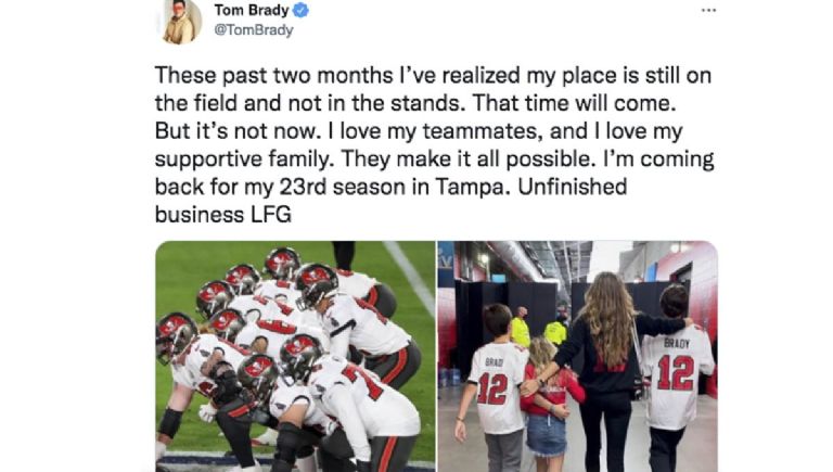 "Estos últimos dos meses me he dado cuenta de que mi lugar sigue estando en el campo y no en las gradas. Llegará ese momento. Pero no es ahora. Amo a mis compañeros de equipo y amo a mi familia que me apoya. Ellos lo hacen todo posible. Regresaré para mi temporada 23 en Tampa. Tenemos asuntos pendientes LFG" publicó Tom Brady en su cuenta de Twitter.