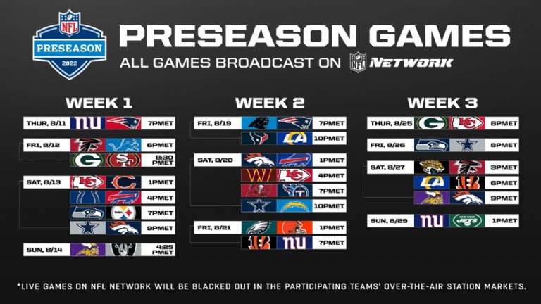 Entre el jueves 4 y domingo 28 de agosto serán en total 49 los partidos de pretemporada de la NFL que se disputarán, comenzando con el Juego del Salón de la Fama en Canton, Ohio, y que enfrentará a Las Vegas Raiders contra los Jacksonville Jaguars.