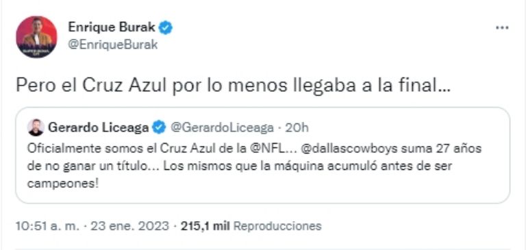 Curiosamente, un comentarista de TUDN se ha vuelto tendencia en las redes sociales dado que, en las últimas horas, tuvo a bien burlarse de un aficionado de la NFL que comparó el presente de los Dallas Cowboys con el de la Máquina de Cruz Azul, quien hasta mediados del 2021 sumaba más de 23 años sin sumar un solo título de Liga.