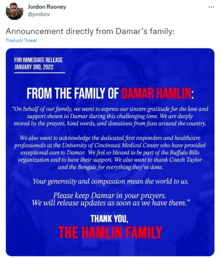 Fue a través de Twitter que la familia de Damar Hamlin compartió su sentir sobre la situación que engloba a su hijo, quien lideraba parte de una de las escuadras más importantes en esta temporada de la NFL. En primera instancia, agradecieron el incomparable apoyo que han recibido tanto de aficionados como de los miembros de la Liga.