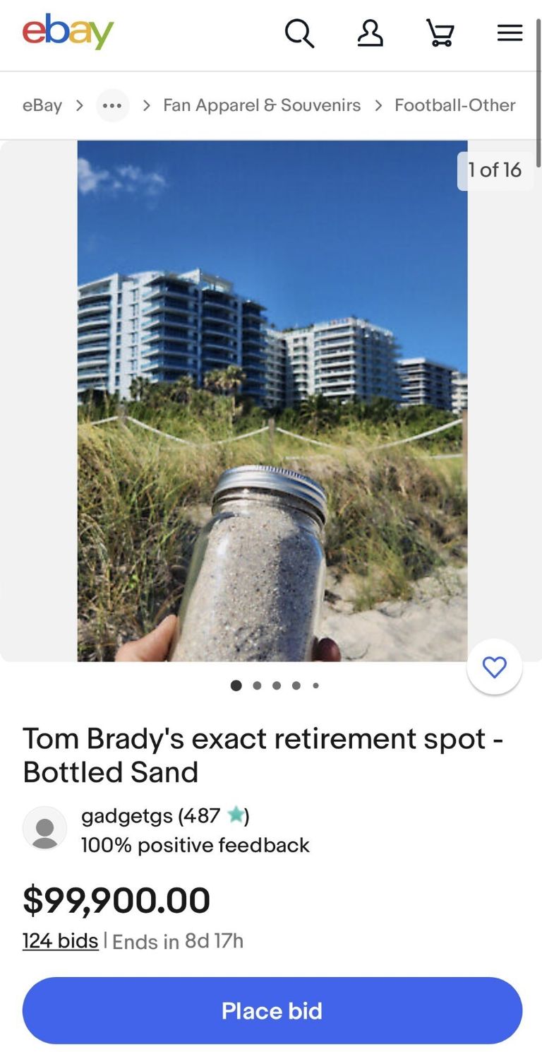 Dicho precio se debe a que, de acuerdo con el vendedor, esa arena tomada del lugar específico en donde Tom Brady habría anunciado su retiro en días pasados.