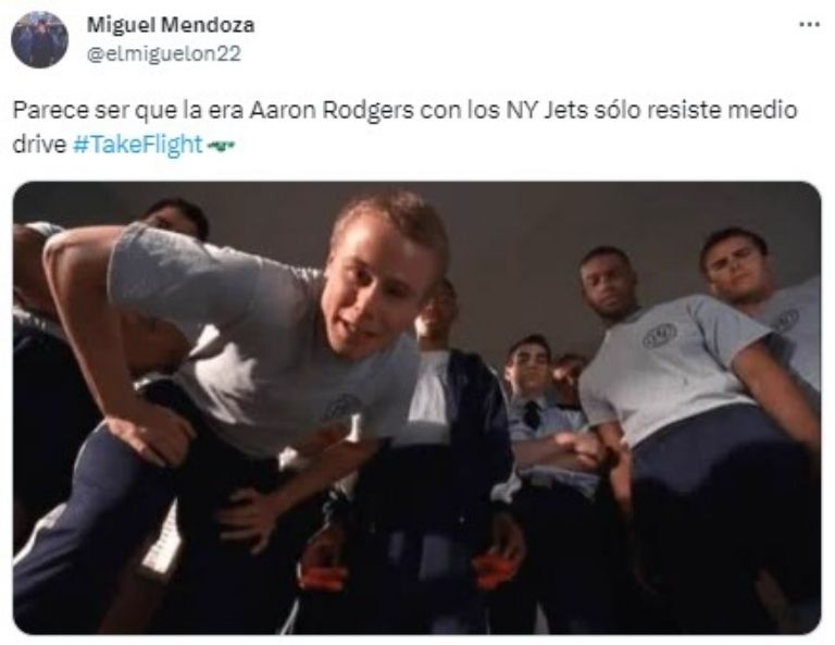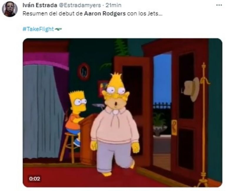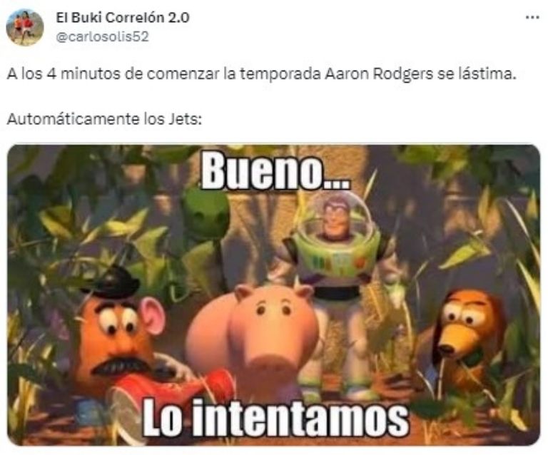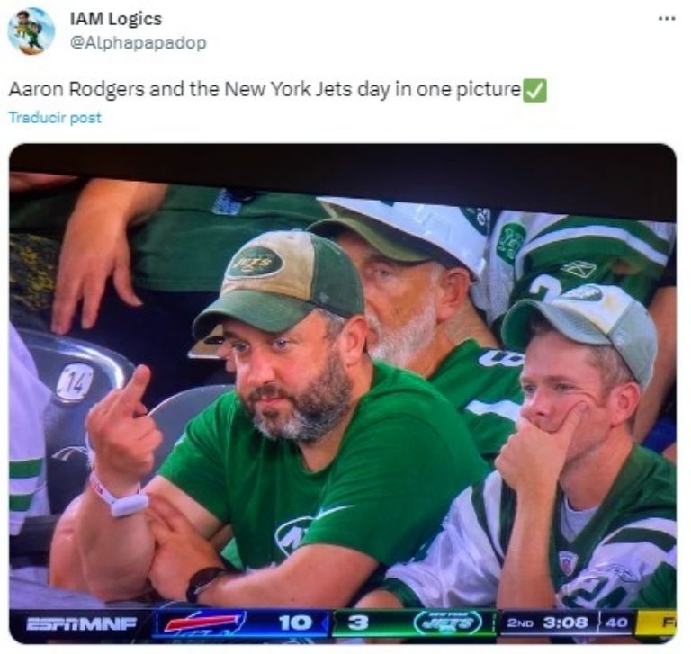 Además, saltó al campo del MetLife Stadium con una bandera de Estados Unidos. Aaron Rodgers era el protagonista natural del Jets vs Bills y una lesión cambió el plan que intentó desarrollar dentro de su nuevo reto en la NFL. Recuerda que tal como Brett Favre, dejó Green Bay para recalar en Nueva York. El destino le sonrió diferente en su debut y los memes lo cobijaron.