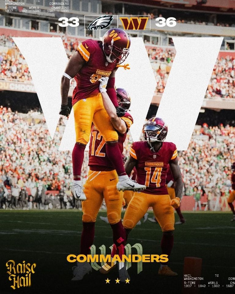 Jayden Daniels se consagró como la nueva estrella de Washington Commanders (10-5) después de guiarlos a una dramática victoria 36-33 sobre Philadelphia Eagles (12-3) en la Semana 16 de la NFL, resultado que los pone cerca de regresar a los playoffs por primera vez en cuatro años. El novato guio una serie ofensiva con menos de dos minutos que terminó por darle el triunfo a los capitalinos y de paso acabó la racha de 10 éxitos consecutivos de sus rivales de división.
