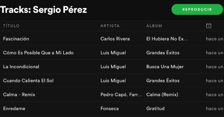 Sergio Pérez parece tener un gusto particular por las canciones de "Luis Mi", con varios temas de él, en su playlist, como La incondicional, Cuando calienta el sol y Cómo es posible que a mi lado.