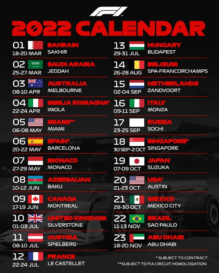 La temporada 2022 arrancará el próximo 20 de marzo con el Gran Premio de Bahréin, aprovechando los test invernales en Sakhir una semana antes, y terminará el 20 de noviembre con el Gran Premio de Abu Dhabi.