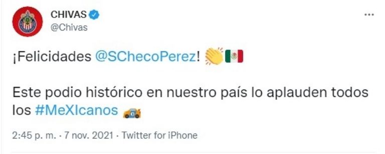“¡Volaste como águila en la pista, Sergio ‘Checo’ Pérez! Felicidades por el tercer lugar y ser el primer mexicano en lograr podio en el GP de México”, escribió el Club América.