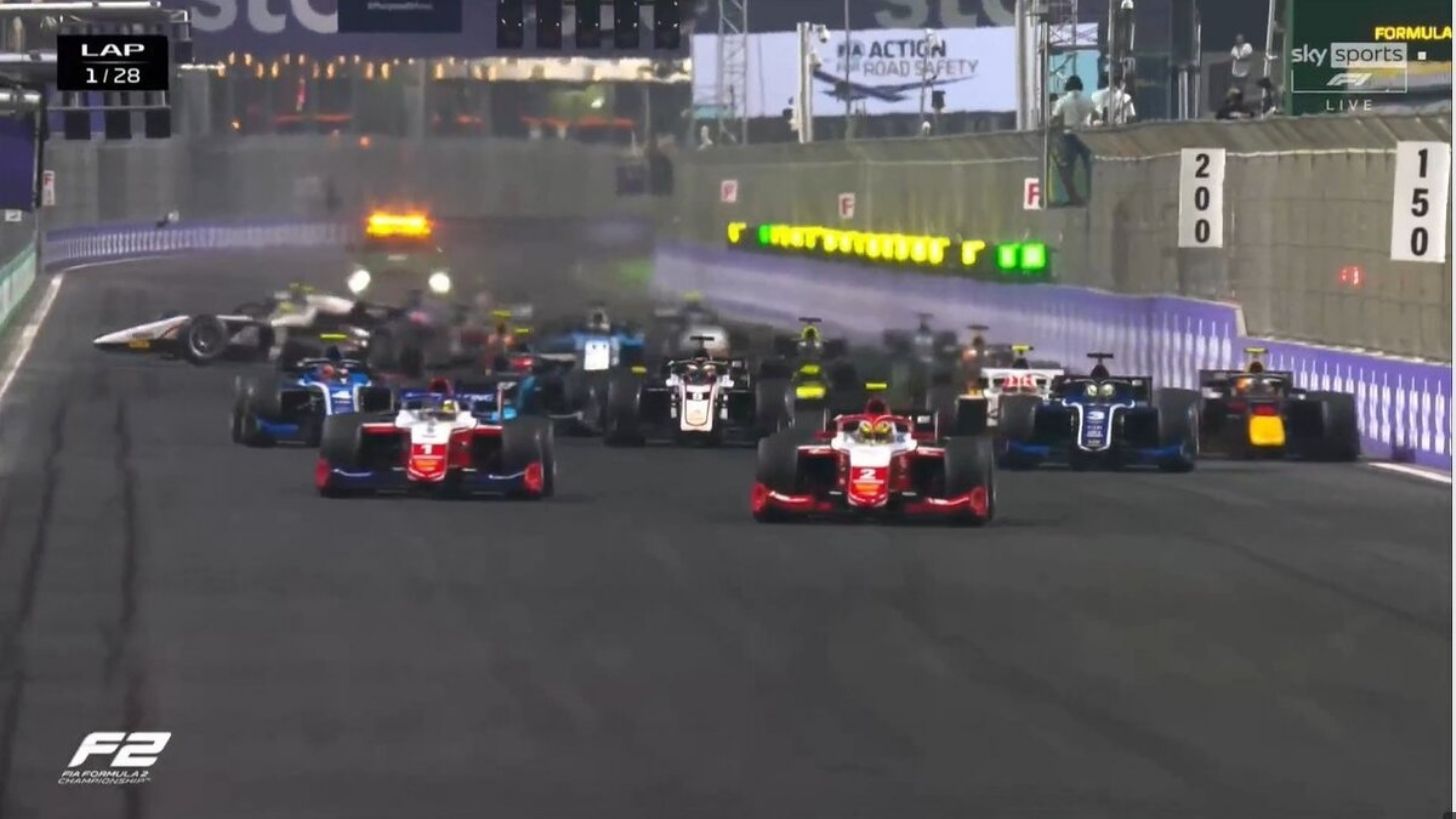 La carrera principal de la Fórmula 2 se suspendió porque hubo un fuerte choque entre Theo Pourchaire y Enzo Fittipaldi. El accidente ocurrió en la largada, ambos terminaron heridos y un helicóptero los trasladó al Hospital de las Fuerzas Armadas King Fahad de Yeda.