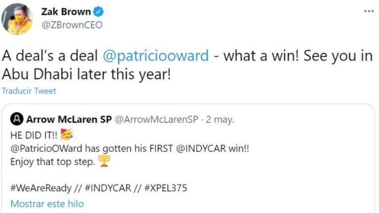 Momentos después del triunfo en Texas, Zak Brown, el jefe del equipo de McLaren en la F1, respondió en Twitter.