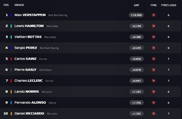 Por detrás de estos cuatro pilotos, aparecen Carlos Sainz (Ferrari), quinto; Pierre Gasly (AlphaTauri), sexto; Charles Leclerc (Ferrari), séptimo; Lando Norris (McLaren), octavo; Fernando Alonso (Alpine), noveno; y Daniel Ricciardo (McLaren), décimo.