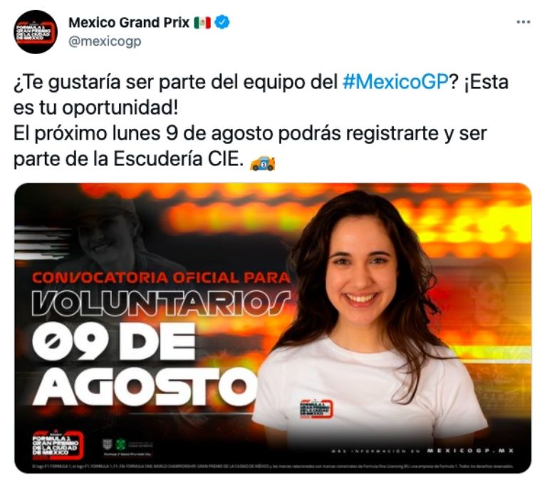 El Gran Premio de la Ciudad de México de la Fórmula 1 anunció la convocatoria oficial para las y los interesados en participar como voluntarios en este magno evento.