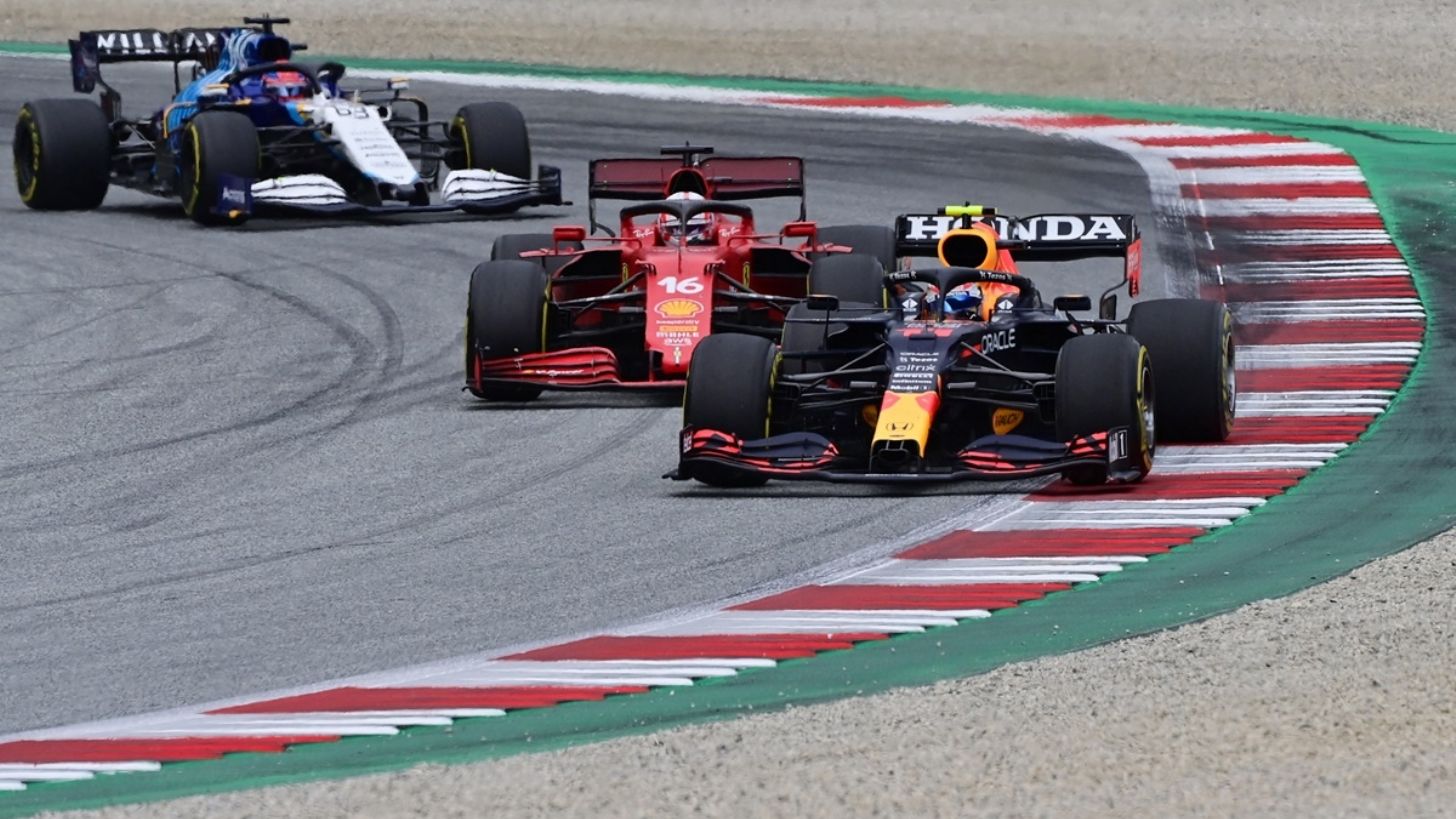 Primero, fue en la vuelta 41 cuando Pérez no deja lugar a Leclerc para que continúe en pista y la Ferrari se fue a la tierra, aunque sin perder posición.