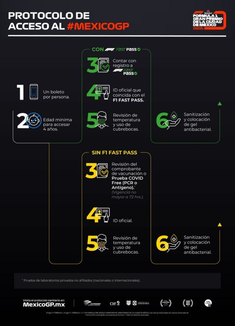 El estricto protocolo sanitario para la fecha 18 del máximo circuito del automovilismo mundial incluye medidas como contar con boleto de acceso y llevar un comprobante oficial de vacunación contra Covid-19, con esquema completo o prueba PCR o de antígenos con resultado negativo, tomada en un laboratorio privado autorizado en los tres días anteriores a la fecha de la carrera.